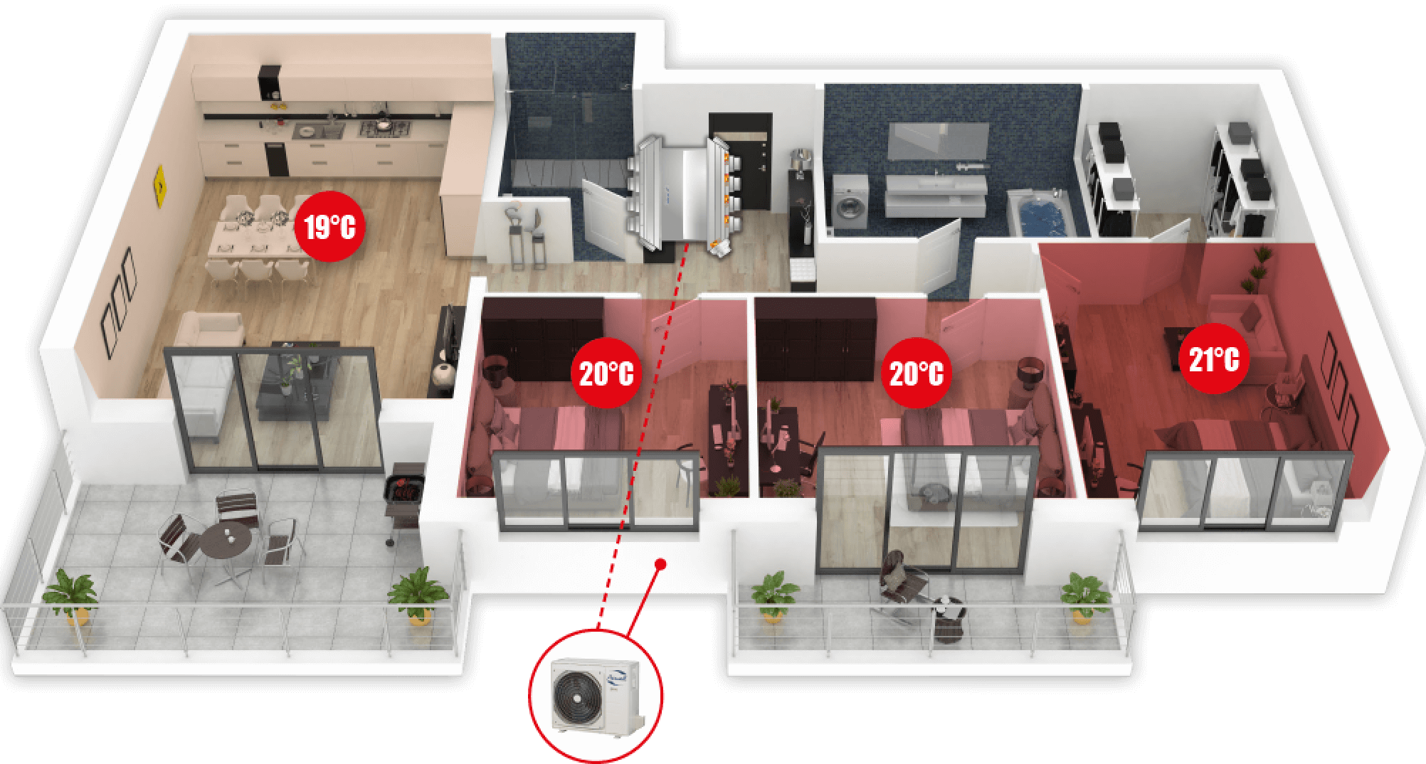 Unser System der individuellen Anpassung ermöglicht eine individuelle Heizungssteuerung jedes Raums, für bis zu 6 Bereiche. Jeder kann seine Temperatur in dem Raum regeln, der für ihn am wichtigsten ist.