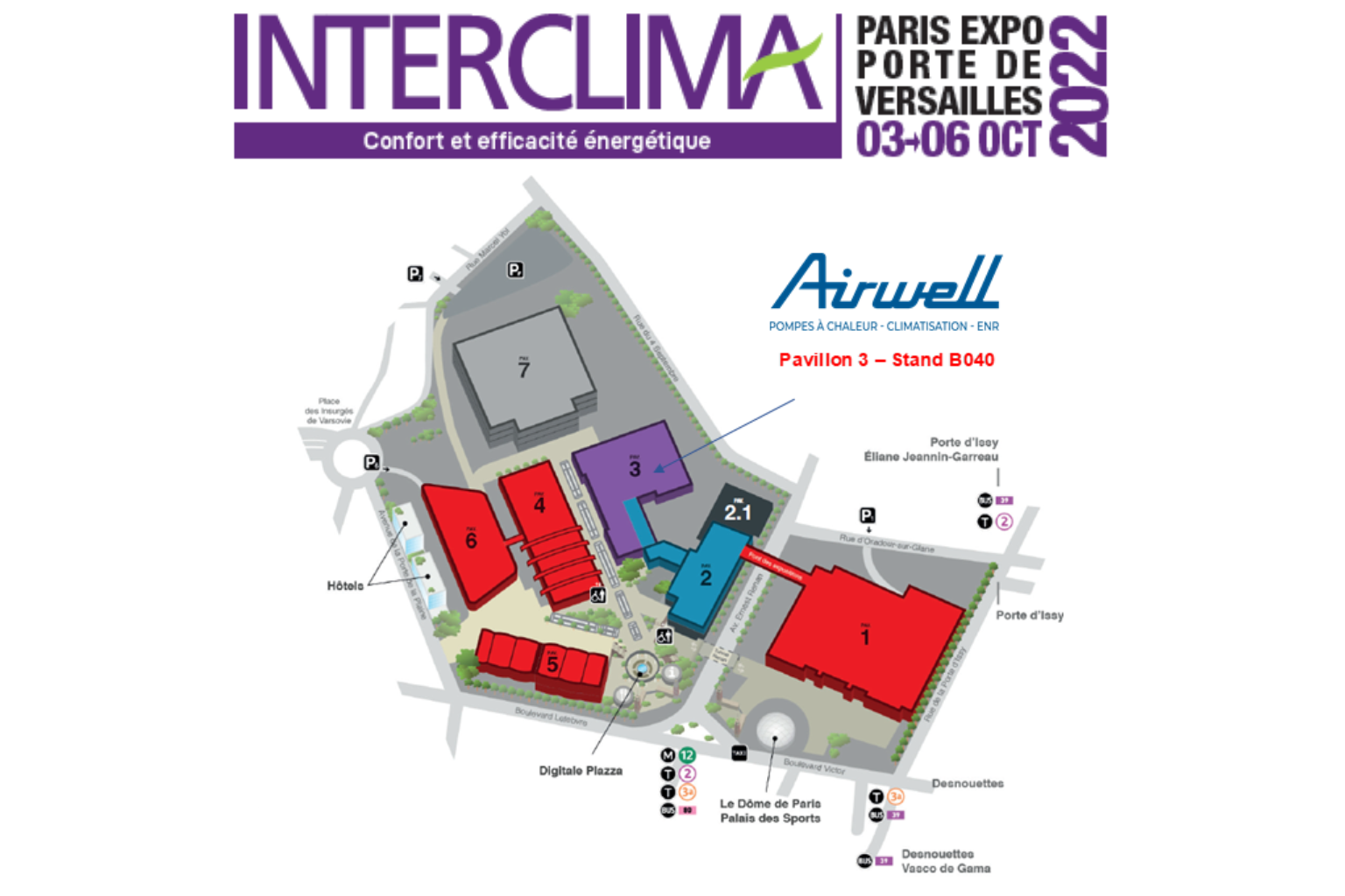 Le salon Interclima 2022 aura lieu à la Porte de Versailles à Paris, Airwell sera présent dans l’Espace Innovation Pavillon 3 Stand B040.